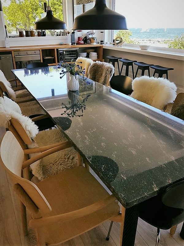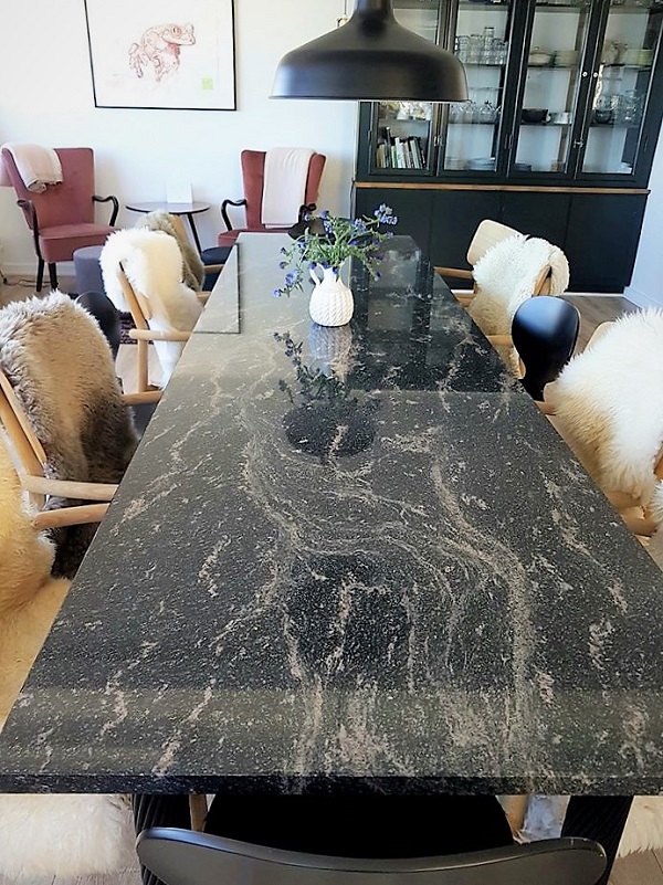 Vi fik leveret det nye spisebord – eget design. Bordpladen er i Gnejs fra Paradisbakkerne – bare 2,5 km fra Villa Vito.