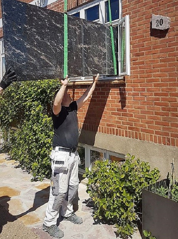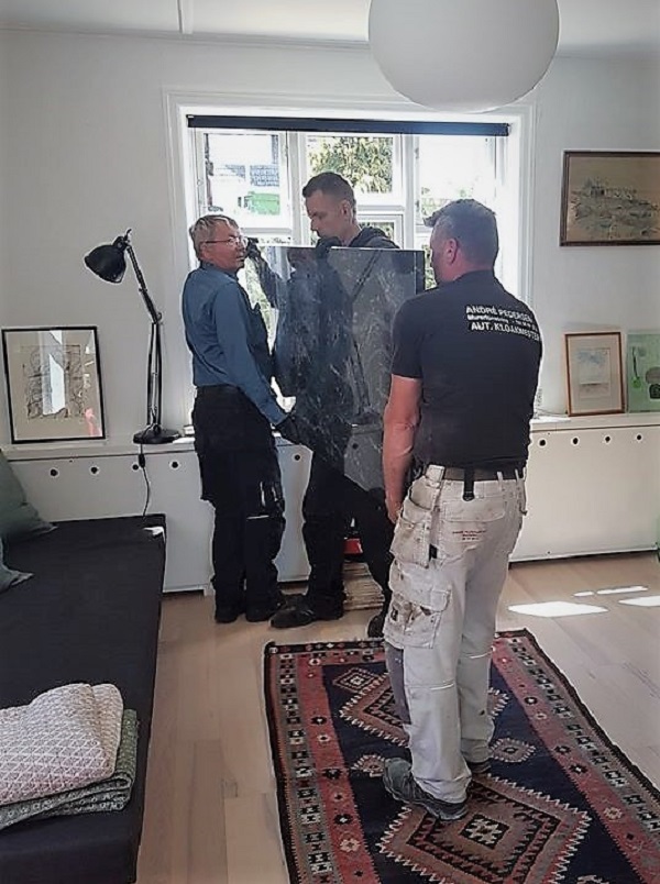 Leveringen stod Skovgård for og styrede kran for at få stenpladen ind gennem vinduet. Henrik og Finn, André Pedersen, styrede for vildt og sørgede for at alt kom sikkert på plads uden en skramme på hverken hus, stel eller plade. 5 mand skulle der til for at få stenpladen ind.